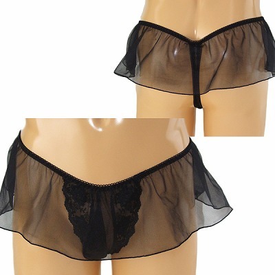 メンズ シースルースカート付きレース刺繍Tバック (ブラック) ブラック