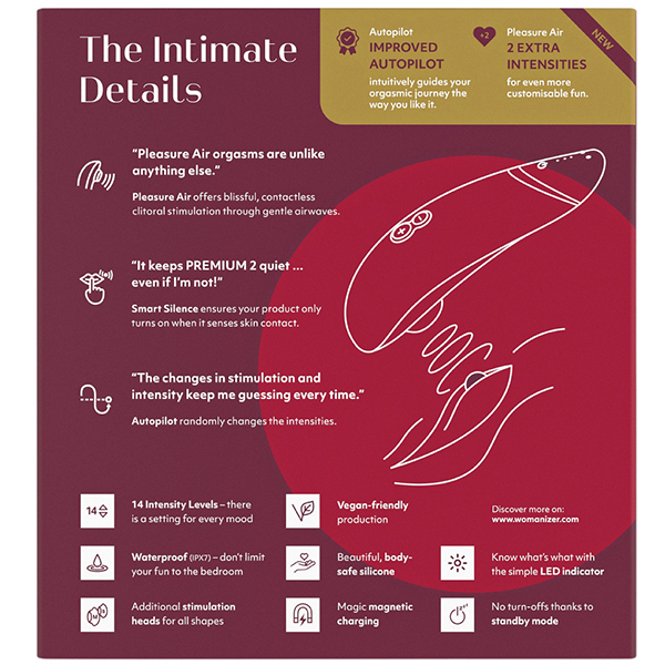 人気のウーマナイザーから待望の商品がリリース!「ウーマナイザー プレミアム2 (ボルドー)」。 その名に恥じないプレミアムな機能を搭載♪ボタンを押さなくてもお肌に当てるだけで吸引が自動でスタートし、離すだけで振動が止まるタッチセンサー機能を搭載。 この機能はカップルさんで使うときにも本当に大活躍します♪さらにパイロットモードを搭載し、ボタン操作をしなくてもWomanizer自身が吸引の強弱を自動でコントロールしてくれます。 これにより予測できないゾクゾクとした楽しみが味わえます♪振動レベルは弱・中・強の3段階!ゆったりとラグジュアリーな時間を過ごすのに最適です♪素材はシリコン/ABS樹脂で2時間のフル充電により連続4時間での使用が可能です。