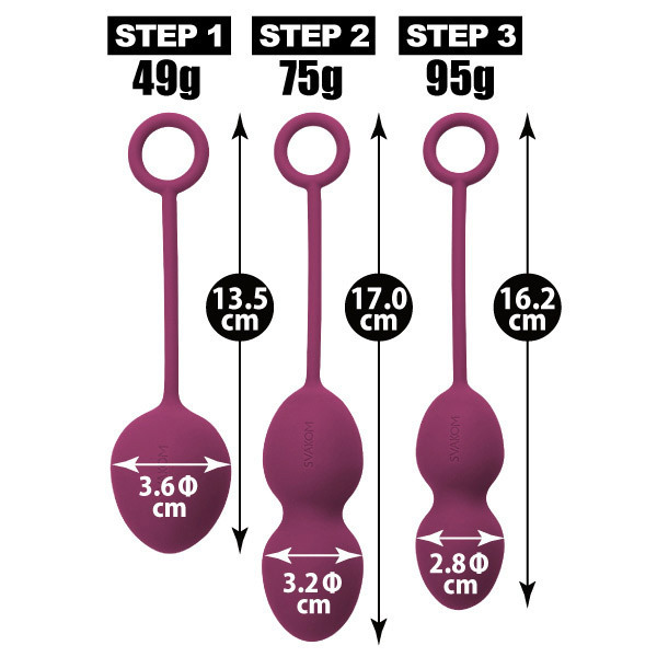 こっそり鍛えて女子力UP♪悩める大人女子の強い味方になってくれる膣トレグッズ。 ●シックで妖艶なバイオレットカラー●形状&重さの異なるノバボール3種入●滑らかでマットな質感のシリコン製●それぞれ内部にメタルボールを内蔵●まずは49gからスタート→75g→95gと徐々にサイズ&レベルアップ●それぞれ1日30分程度を30日間継続●挿入したままスポーツなども可能●100%完全防水で丸洗いOK。 体の動きに合わせてランダムに動くメタルボールを感じよう!最終段階まで進めば、眠っていた骨盤底筋の目覚めを感じられるはず。 ソファなどに座りリラックスした状態か、立った状態で片足を上げると挿入しやすくなります。