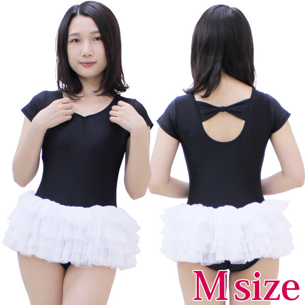 チュールスカート付き半袖レオタード(後ろリボン) 黒×白 M
