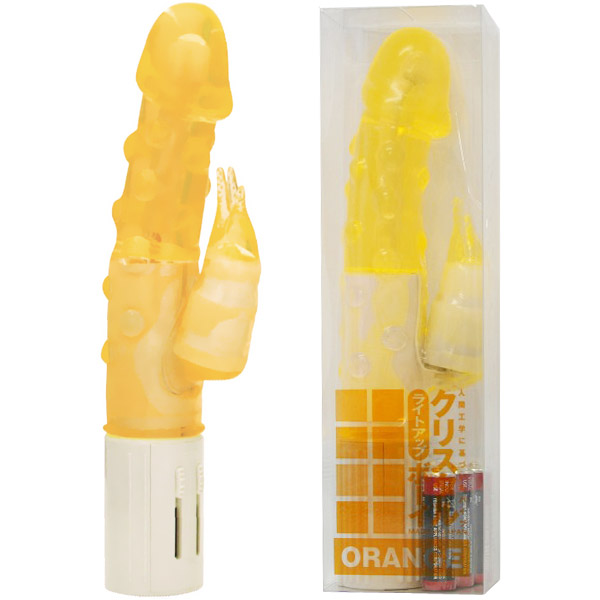 人間工学に基づいた最先端のバイブ「クリスタルボーイ オレンジ」。 美しいスケルトンボディは暗闇でも怪しく光り輝き、ムードは盛り上がることマチガイなし!本体の表面の大粒のイボイボに加えて、カリの直径は約3.8cmと存在感抜群!子機にいたっては3枚舌仕様。 さらに、スイングとバイブの個別動作が可能…などなど、至れり尽くせりの優秀バイブです。 単3電池×3本使用。