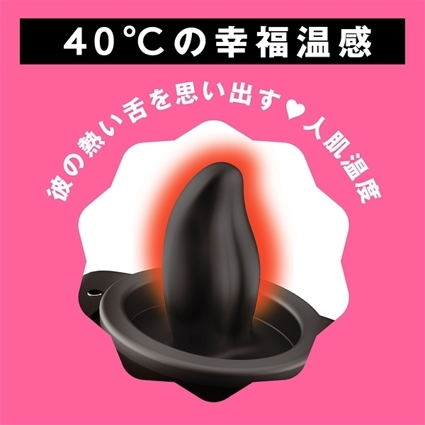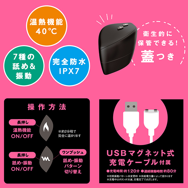 アツくて甘〜い愛のご奉仕クンニ_超!愛を感じる舐めローター!彼の熱い舌を思い出す温感機能は40℃まで温まる人肌温度_先っぽで刺激するチロチロクンニからグイグイ舐め上げる激しいクンニまで多彩なクンニが楽しめちゃう_さらに7パターンの振動機能付き!震えるあったかベロでとろける濃密前戯_やっぱりクンニがナンバー1!!!完全防水なので使用後のお手入れもラクチン♪敏感な部分に直接使うものだから、優しい肌あたりの高品質ソフトシリコンを使用しました。 衛生的に保管できる蓋付きです。 振動・舌舐め:7パターン&完全防水IPX7等級&充電用USBケーブル付属。 カラー:ブラック