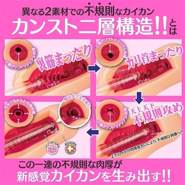 前半はドゥルドゥル、グニュグニュな強刺激!カリ首と裏筋に連続で押し寄せる連撃。 奥にはランダムに現れる大粒のイボイボ!イボや壁には更に細かなつぶつぶが敷き詰められておりスキがない。 最奥にはアナタを受け入れる準備万端のダブル子宮が待ち受ける!
