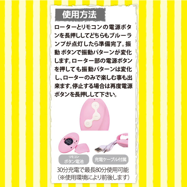 ショーツや指に固定して使えるベルト付きのUSB充電式ワイヤレスローター。 10種類の振動アクション×最大8mの遠隔操作機能を搭載!肌触り滑らかなプレミアムマットシリコン素材を採用でIPX7の完全防水製。 ローターにもスイッチが付いているため、単体での使用も可能!1人は勿論、パートナーと一緒に遊んで楽しもう♪リモコンはボタン電池を1個使用