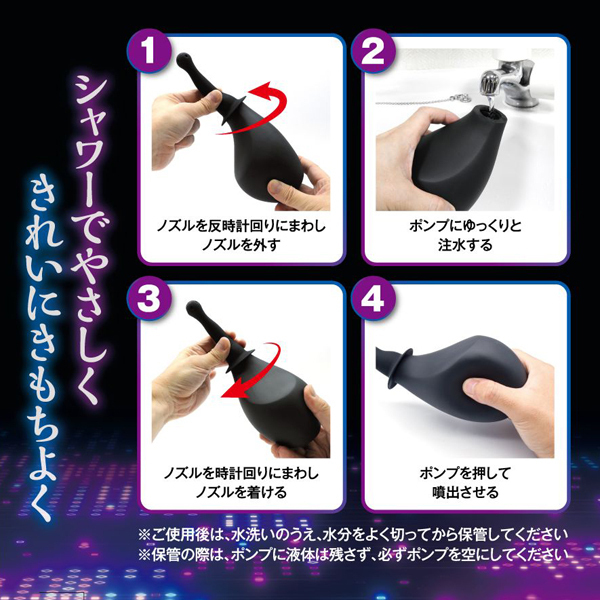 シャワーでやさしくきれいにきもちよく。 アナルほか噴出洗浄器「エイナスシャワー」!ラブ・ライフにぴったりな多目的洗浄器が新登場。 大容量360ミリのポンプに水を入れれば、先端ノズルの四方の穴からビュビューッと噴出できちゃいます!先端ノズルは、差し込んで使えるように、硬めのハードシリコン仕様。 ポンプは、水を押し出すように、ふんわり柔らかなソフトPVC素材!ノズルとポンプは分割可能なので、注水やお手入れも簡単です。 いろいろ使える噴出ポンプなので、アナルやアソコの洗浄はもちろん、オナホの内部洗浄もOK!中に液体を変えれば、ローション注入器や洗浄液注入器とも使えちゃう!