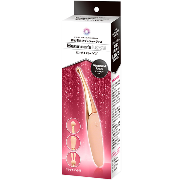 実際の商品は2〜3cm程サイズ前後します。 〜初めての方に優しく愛を込めて〜初心者(入門者)に特化したをBeginner’s Loveシリーズが新発売スタンダードなピンポイントバイブの入門商品です。 <ピンポイントバイブ>・クリト〇スや乳〇等を集中的に刺激可能・シンプルなワンボタン式で面倒な操作は不要・3種のアタッチメント付きで様々なシーンで楽しめる・振動パターンもオーソドックスな5種類を実装・バイブ初心者でも挿入しやすい、スリム設計ボディ■使用方法@同封のUSBケーブルを本体の下部にしっかりと差し込み充電します。 Aボタンスイッチの長押しで、電源オンになります。 Bボタンスイッチを押すごとに、バイブレーションのパターンが変わります。 Cボタンスイッチの長押しで、電源がオフになります。 Dご使用後は乾いた布でやさしく拭き、乾燥させてください。