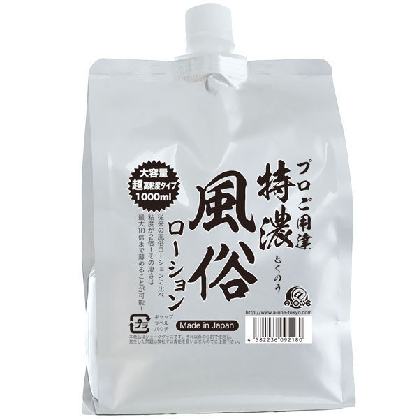 大容量1リットル!風俗店御用達「風俗ローション」に超高粘度の特濃バージョンが登場。 従来の「風俗ローション」に比べ、粘度が約2倍!使用時に水やお湯で薄めれば、最大10倍の容量になるのでとっても経済的!ソープごっこやマッサージなどの本格的なローションプレイをご自宅で楽しめます!プロ納得の高品質ローションです。