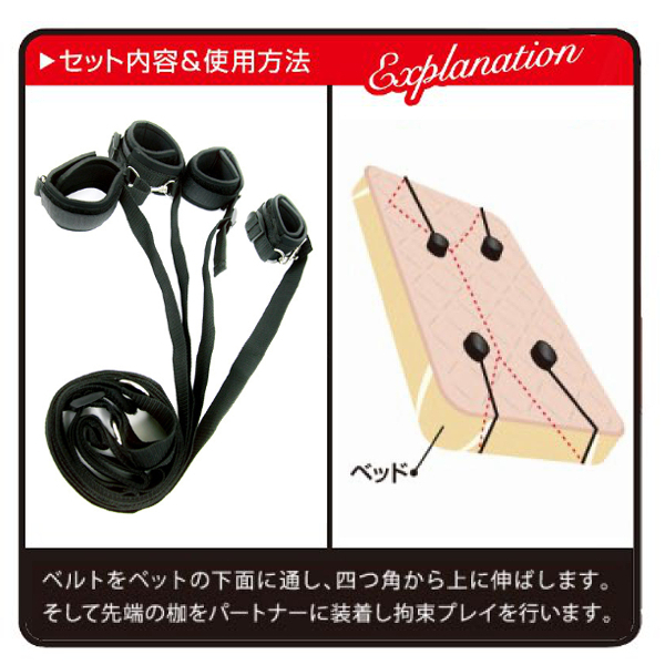 ベッド拘束プレイを自宅でも!あなたの欲望を叶えるSMグッズシリーズ「ELock」。 ベルトをベッドの下に通して上下から出し、手枷と足枷をパートナーに装着したら完成!ベッドの脚に繋がなくても良いので、マットレスタイプでも使用可能です。 枷はマジックテープ式でサイズ調節も楽々!肌に当たる部分はソフトなウレタン素材を使用し、お肌を痛める心配もありません。 エロ絵師、尾髭丹氏の肉感的なパッケージにも注目です。