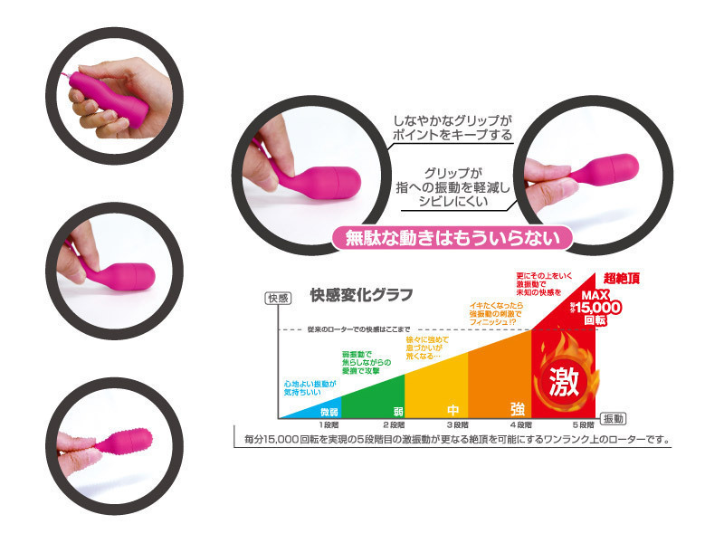 定番のシングルローターに使いやすさをプラス!持ち手部分がついてグッと遊びやすくなったコンパクトローター。 尻尾のようなつまみ部分を持って使用することで、振動による手の痺れがなくなって快適!より長く責めることができるようになり、ラブタイムにもいっそう熱が入るかも。 微弱〜激までの5段階調節で、未知の快感を得られるシングルローターです。 単四電池×2本使用。