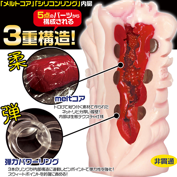 肉厚の外壁&トロトロ膣内素材の間に、3つのリングを内蔵した新発想のオナホール。 肌色の側面にもビラビラを刻み込み、ちょっとしたグロさをアピール!膣括約筋・Gスポット・ポルチオにある、3つのパワーリングの弾力で、まるで三段俵締めの名器のような吸い付き&締め付けを味わえる、非貫通型・無次元オナホールです。 ペニスが欲しくてたまらず、欲情しちゃったアソコをご堪能ください!