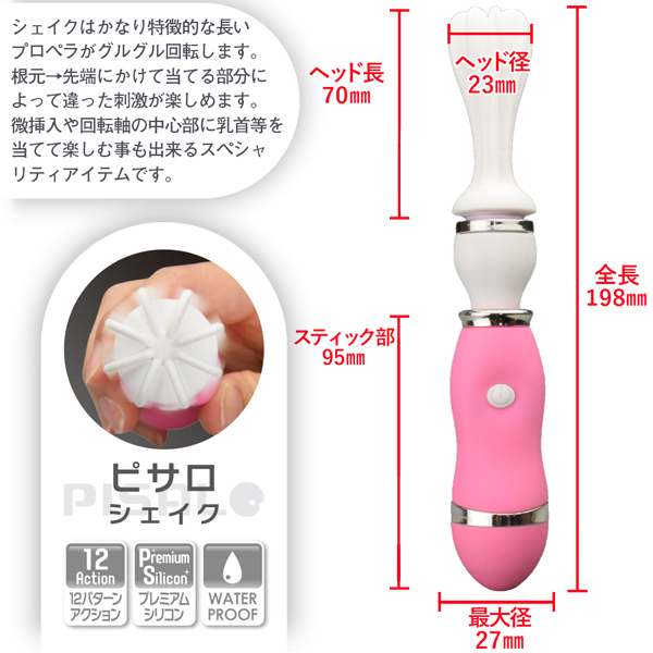 ハンドミキサーのような形状が特徴的なアダルトグッズ。 長いプロペラ付のヘッド部分がクルクルと回転し敏感部分を刺激♪当てる部位によって異なる刺激をお楽しみいただけます。 アクションは12種類搭載!持ち手にはマットラバーを、ヘッドには柔らかな医療用シリコンを採用し長時間のプレイにも対応、メンテナンスしやすい生活防水設計。