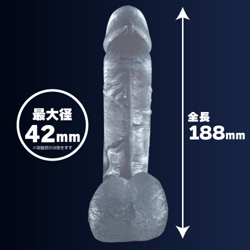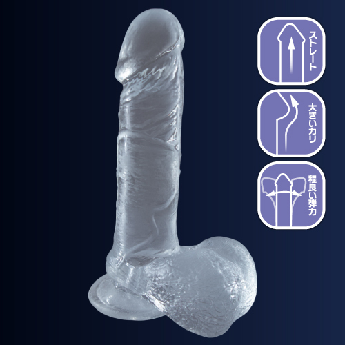 先っぽから根元までずっぽりと太く真っ直ぐ奥まで届く「クリアディルド(Lサイズ)」。 ストレート形状で大きなカリ、そして程よい弾力が特徴で、平均的な日本人サイズのペニスでは体験できない快感が味わえるのが自慢です♪太く、まっすぐ向き合う太い俺!透明ディルドで吸盤付きで、挿入感がたまらないので太さと大きさを求めている方におすすめです♪